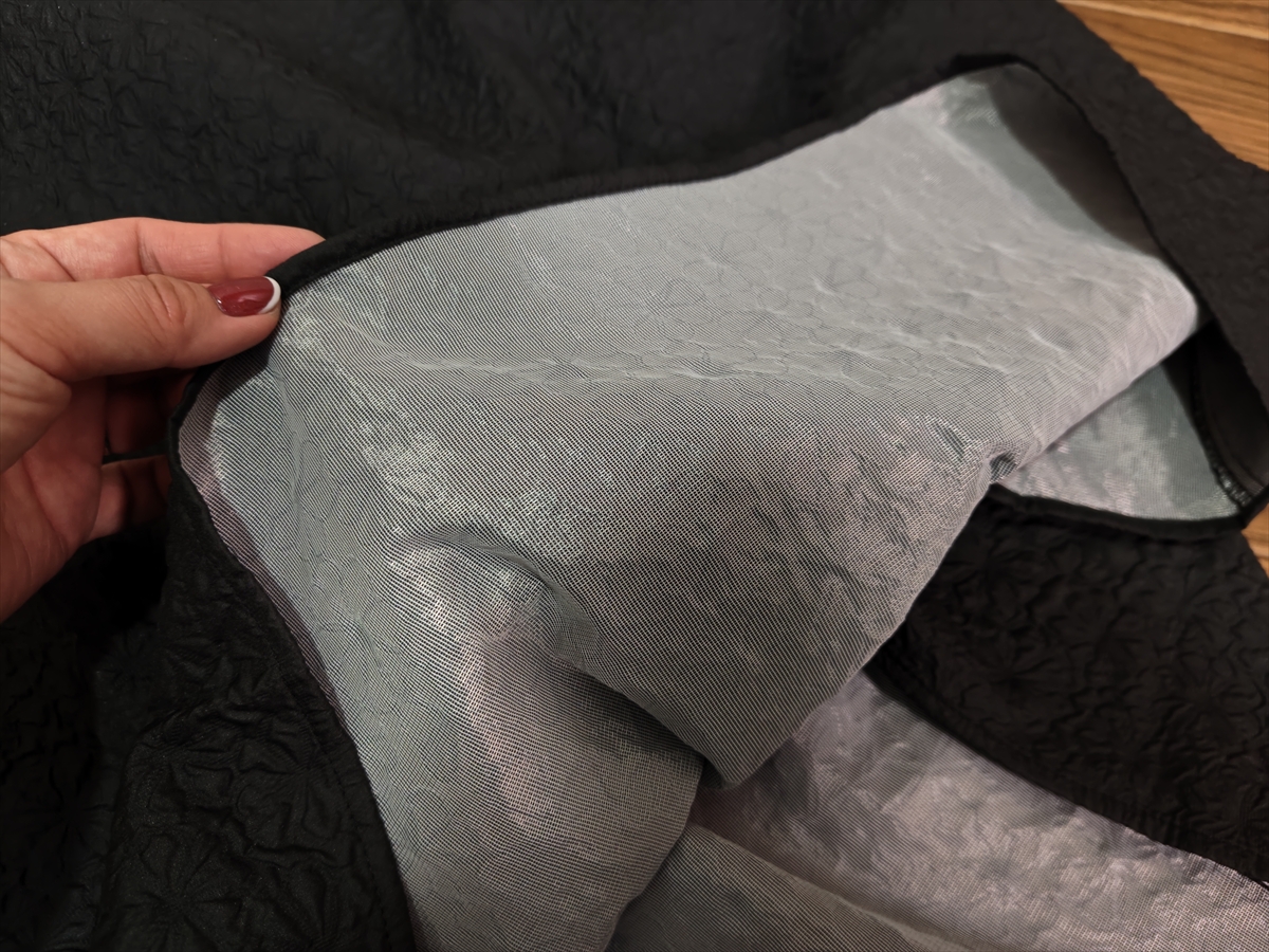 生地がしっかりしていて、裏地はないけど透けなくて使いやすそう。全体的にお花のエンボスが付いていてさりげなく可愛い。
