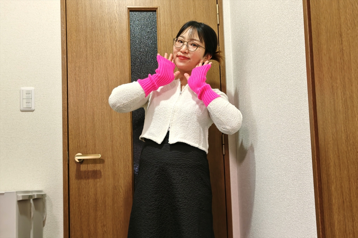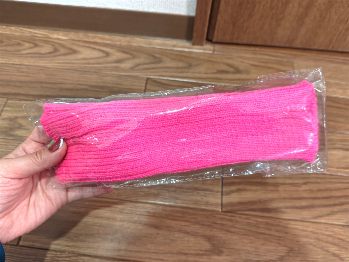 そして最後は、派手な色の小さなニットアイテム。何かと思えばアームウォーマーだった。