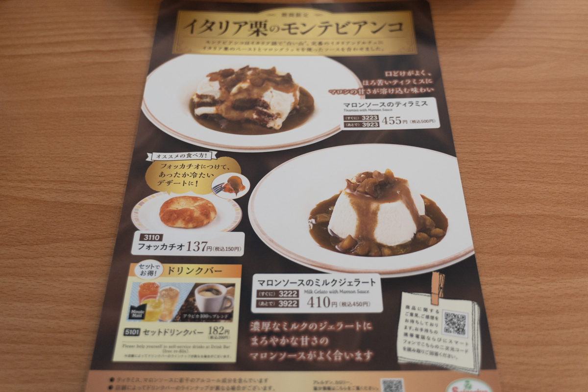 どういうことか? 「イタリア栗のモンテビアンコ」という括りで提供されているのは「マロンソースのティラミス(455円)」と「マロンソースのミルクジェラート(410円)」。