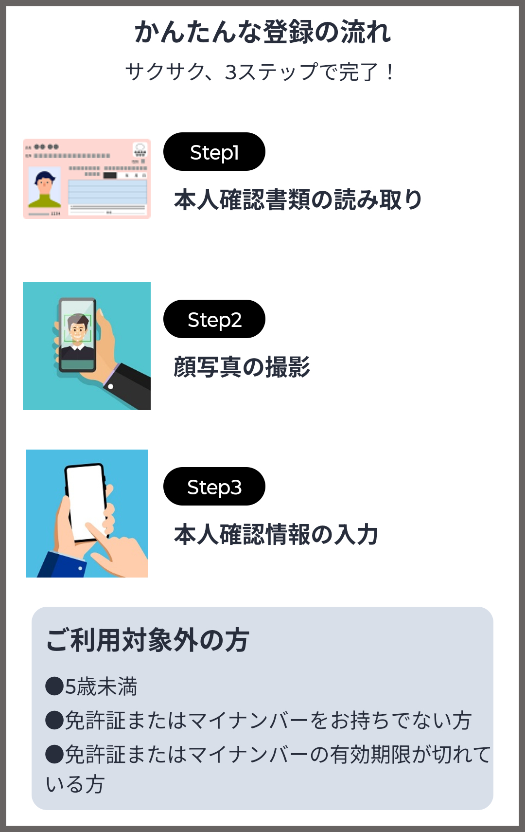 登録は本人確認書類の読み取り・顔写真撮影・本人確認情報の入力を行う。なお、5歳未満、免許証・マイナンバーを持っていない、または有効期限が切れている場合は登録できない。