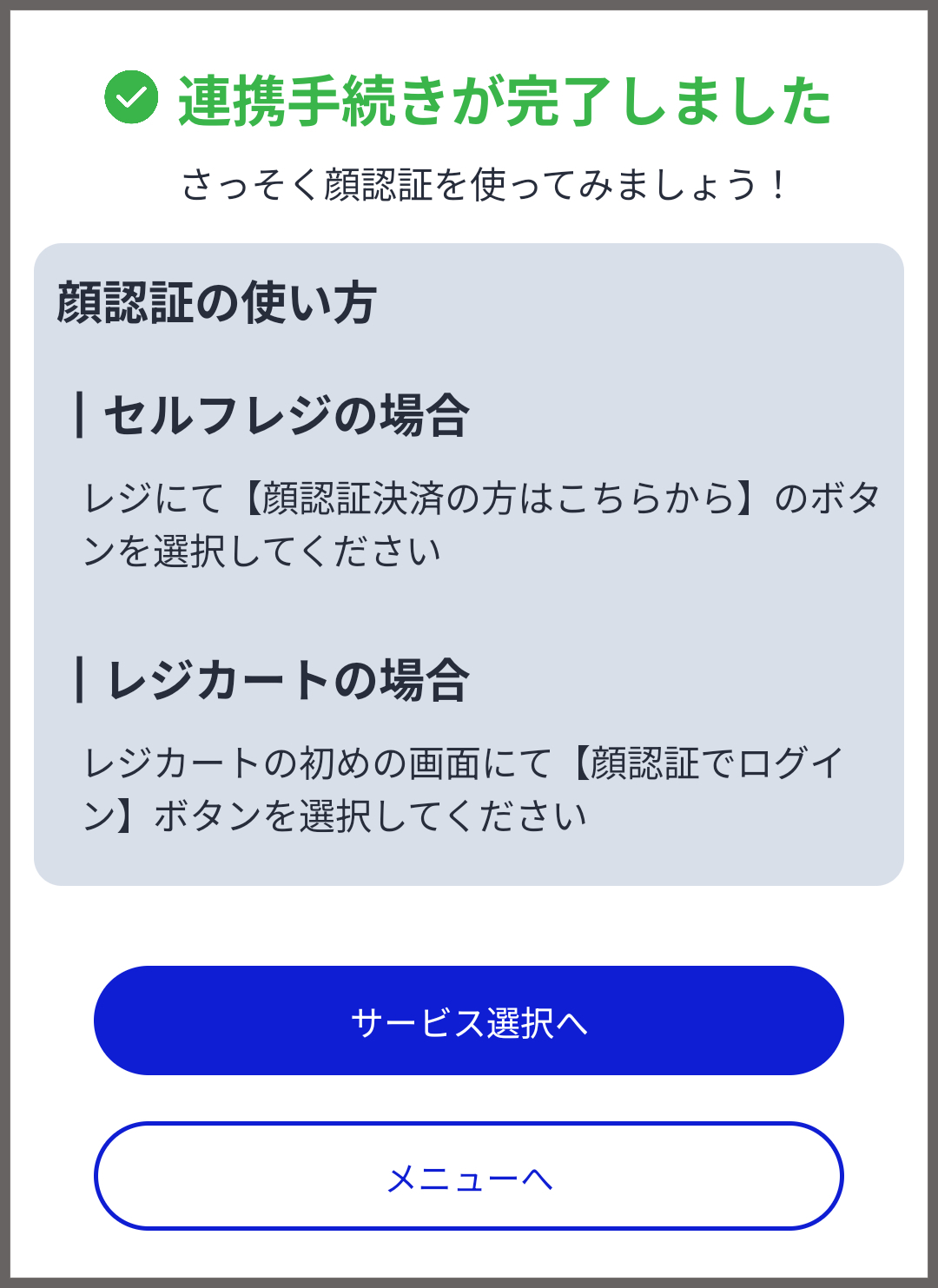 店舗でセルフレジを利用する場合は「顔認証決済の方はこちらから」のボタンを。レジカートの場合は「顔認証でログイン」をそれぞれ選択するとのこと。