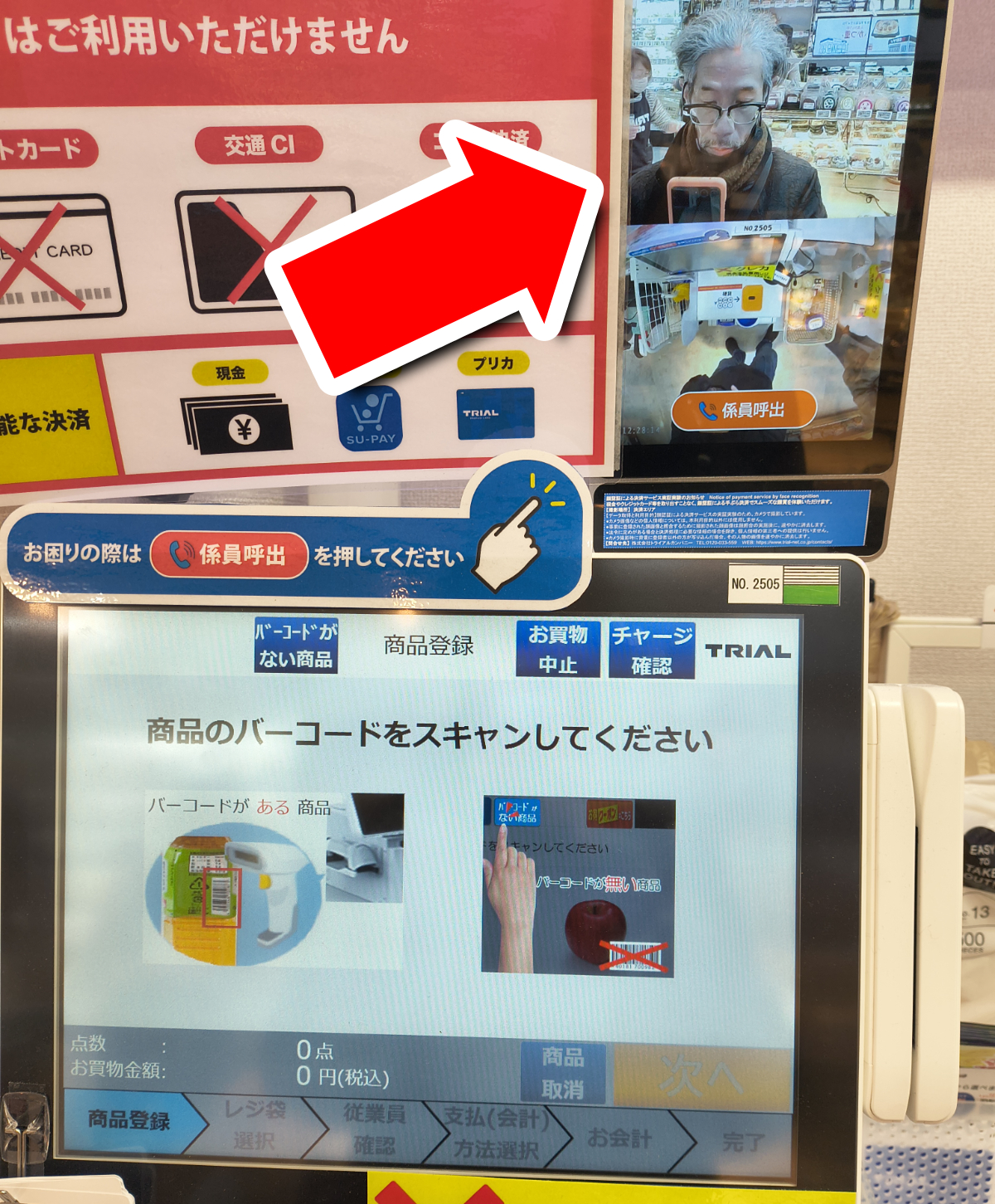 カメラに顔を向けると……ピッ! と鳴って「商品のバーコードをスキャンしてください」の画面に変わった。
