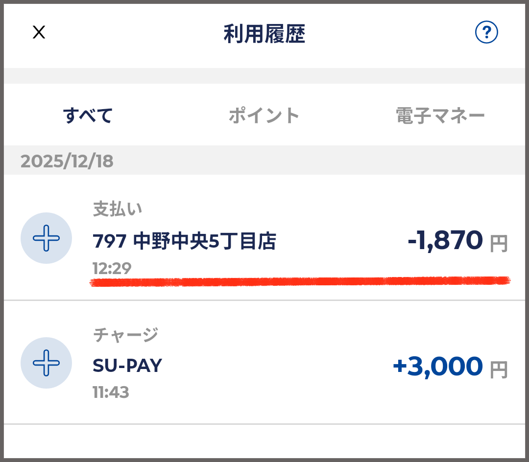 ナニコレ!? めっちゃ便利。使い慣れたら、ほんとに顔パスで買い物できちゃう。スマホも財布も忘れた時でも買い物できるって、すごく便利じゃない? 改めてアプリの利用履歴を見てみると、ちゃんと決済されてました。