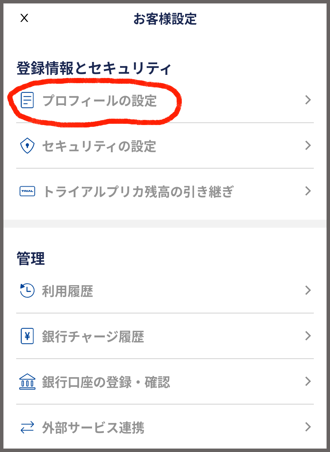 歯車アイコンをタップすると「お客様設定」が開くので、「プロフィール設定」に進む。そこで住所・氏名など個人情報を登録するのである。