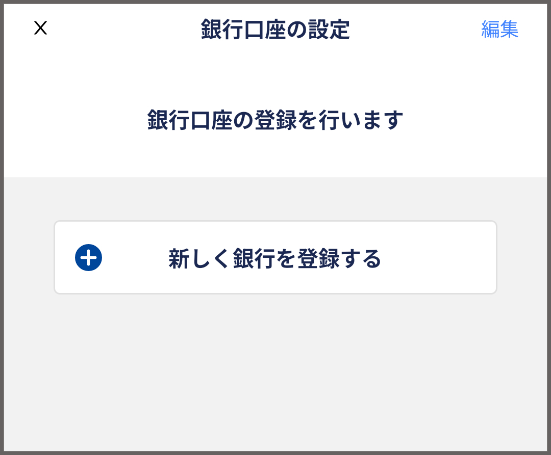 続いて、ホーム画面から「チャージする」をタップすると、銀行口座の設定へと進む。初期状態では登録されていないので「新しく銀行を登録する」をタップする。