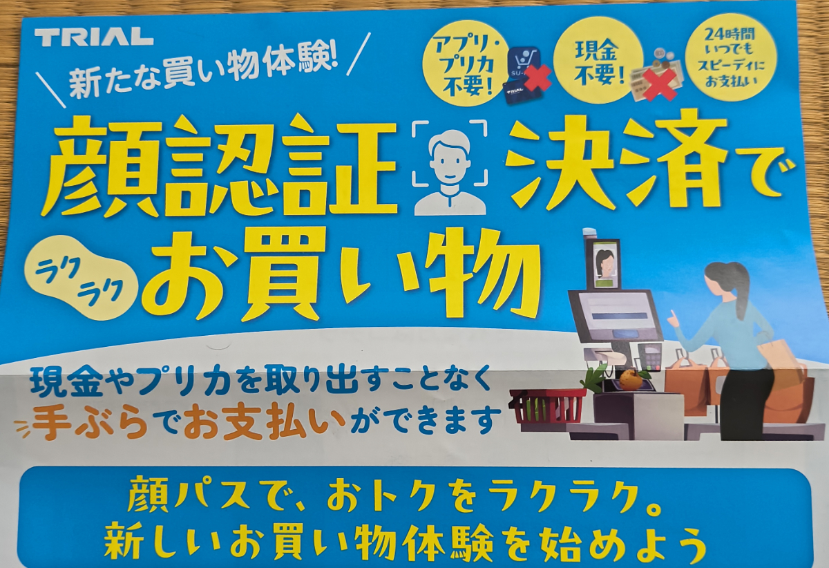 顔認証決済は、トライアルGOの中野中央5丁目店がオープンした日に受け取ったチラシで知った。調べたところ、トライアルは2022年頃から顔認証決済の実証実験を繰り返しており、昨年から本格導入しているようだ。