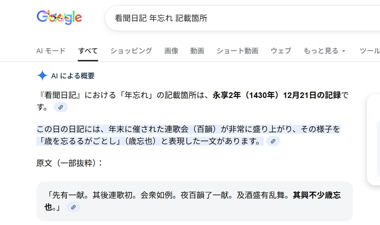 その連歌を複数人で回す集まりは連歌会(れんがえ)と呼ばれ、当時、貞成親王が住んでた伏見殿では、毎月25日に連歌会が開かれていたという。日記に出てくる「月次の会」はその連歌会のことで、12月の連歌会で「歳忘」したという話だ。