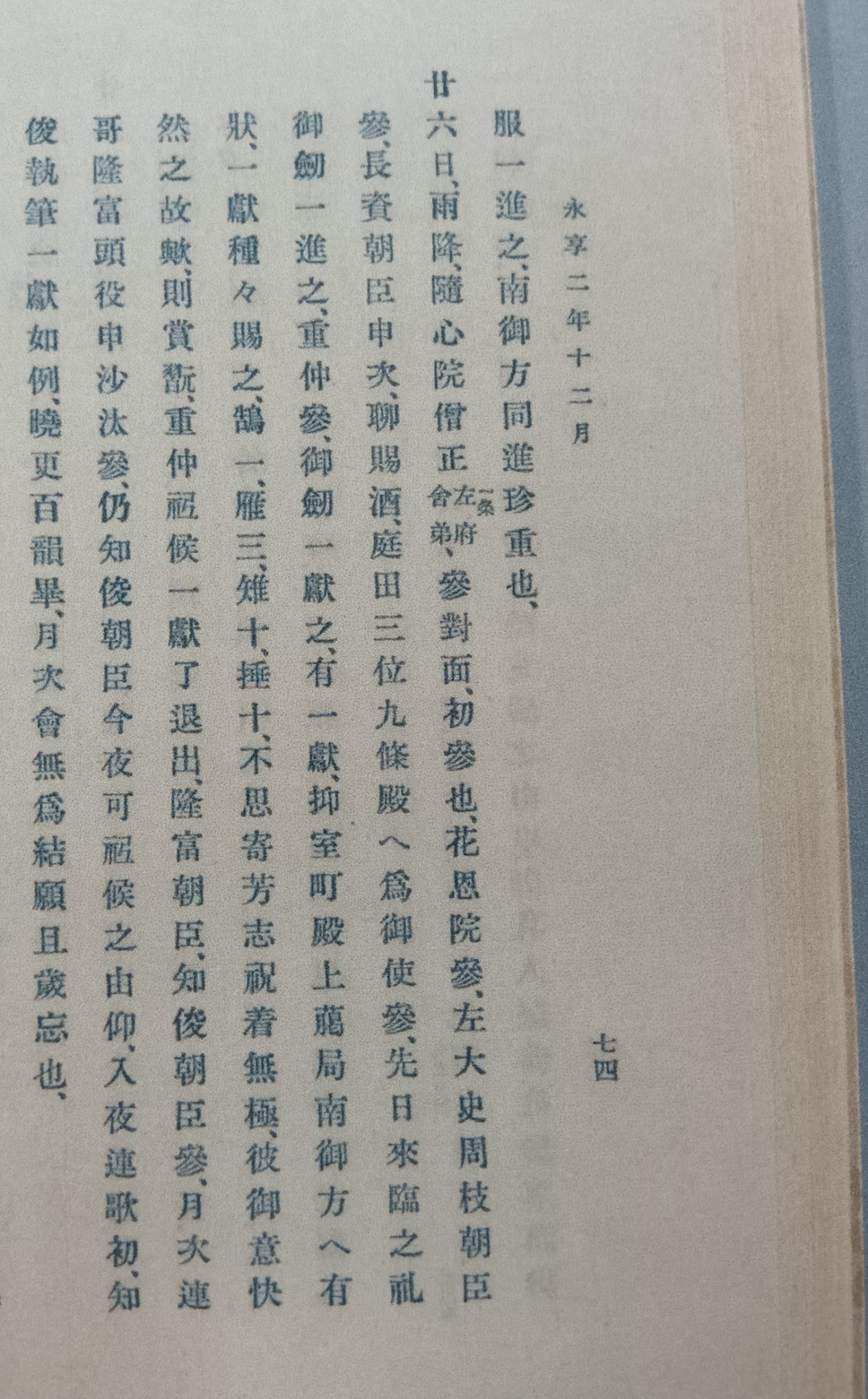 夜が更けると、連歌が初めて行われ、知俊が筆を執り、一献を例に従って献上した。明け方には百韻の詩が詠まれ、月次の会は無事に結願し、歳を忘れることができた」