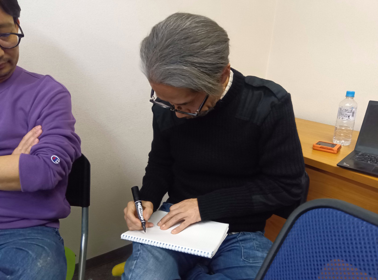 そして、1周の最後は佐藤英典記者。人数が9人なので佐藤記者が上の句を詠むと、次はトップバッターの私が下の句になる。どんな上の句が来るのか? さすがに時間はいっぱいあったのでスラスラ書きだす佐藤記者。