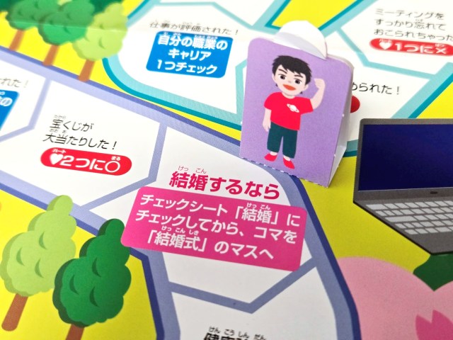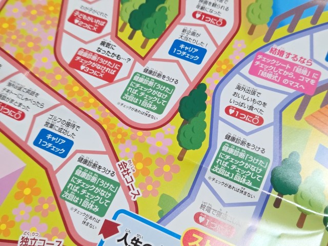 結婚ルートには「2人で食べる朝食が最高においしい(ハート2つに〇)」だなんてマスがあるのに対して、結婚を選ばなかった人が通るルートには「カードゲームでレアカードを引いた(ハート1つに〇)」「合コンに行ったけどあまり話せなかった(ハート1つに✕)」なんてマスも。やけにリアルでなかなか心にくるものがある。