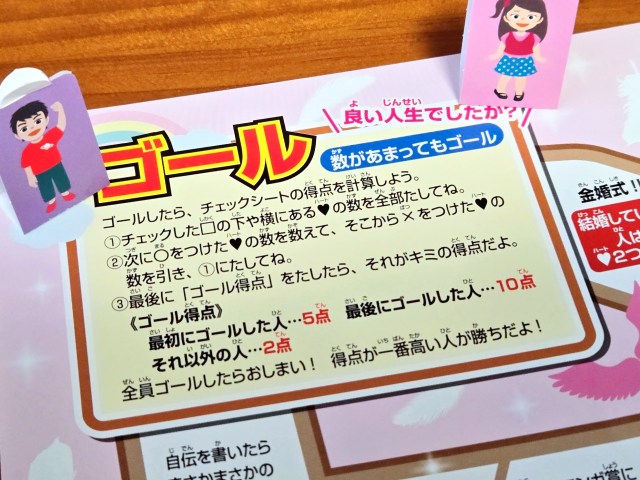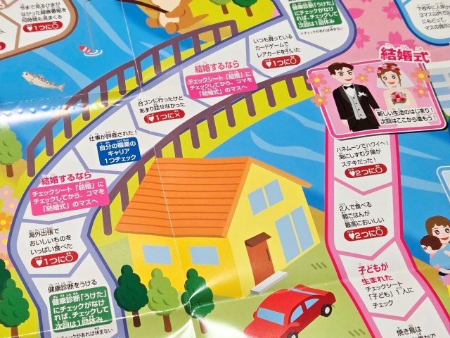 付属のチェックシートにゲーム内で得た「ハート(幸せ)」の数や、キャリアなどを記載していき、最終的に集めたハートをポイントに換算するってわけだな。すごろくを遊ぶ上でチェックシートは必須なので、何度も遊びたい人は先にコピーを取っておこう。