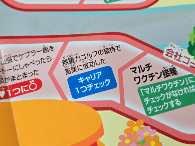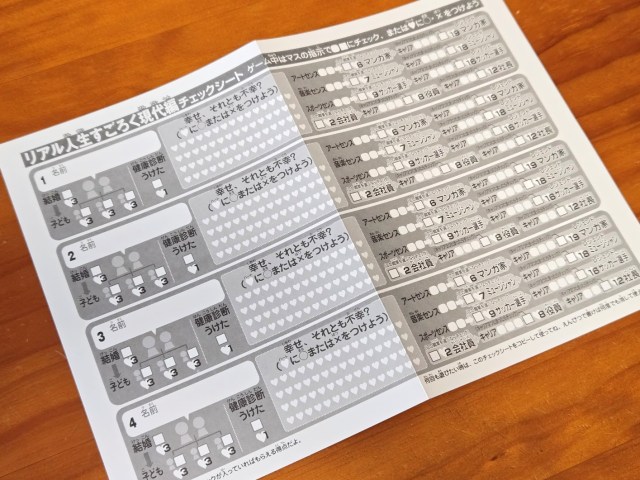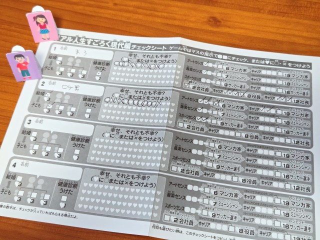 自分が子供だったら何も考えず楽しく遊べたんだろうけど、30前半という微妙すぎる年齢がゆえにこのリアル人生すごろくが他人ごとには思えなかったのだ。ところどころえぐられるマスがあったし、なにより幸せがチェックシートで可視化されるのがやばい。