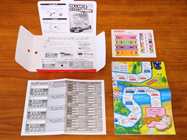 100円のわりには結構しっかりしていて、中には「ゲーム盤」「チェックシート」「サイコロ・コマ」が入っている。