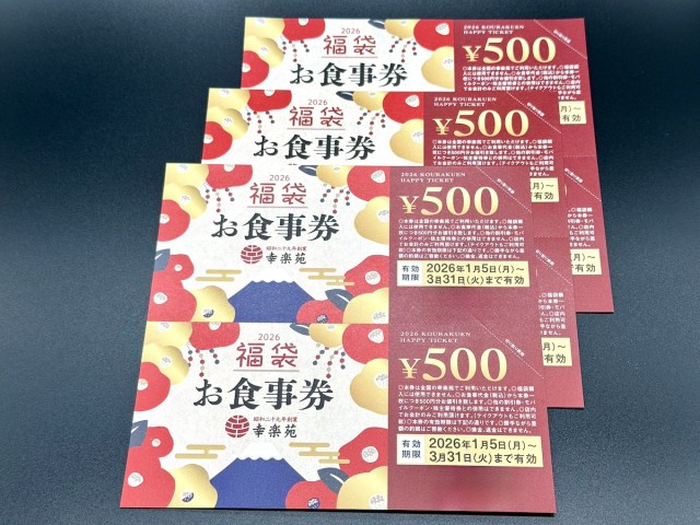 主役はやっぱり500円券×6枚=3000円分のお食事券! 利用期間は2026年3月31日(火)までとやや短めだが、全国の幸楽苑で支払いに充当できる食事券だ。福袋の購入金額が税込3000円だから、この時点で元とれ確定。絶対に損しない。