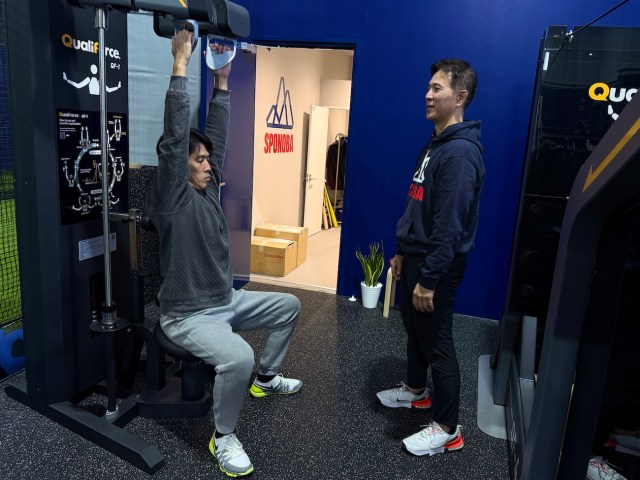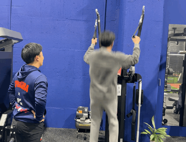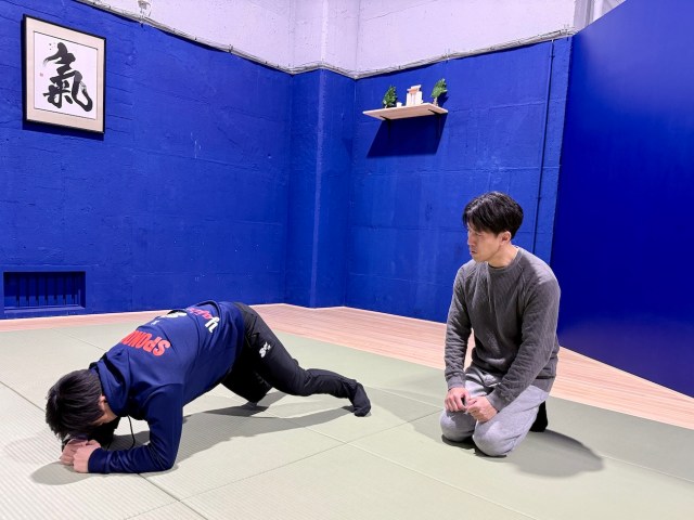 力を入れるタイミングを体で覚えるためにマシンを使って軽いトレーニングを行う。激しい筋トレではなく、コツをつかむための練習のようなもの。