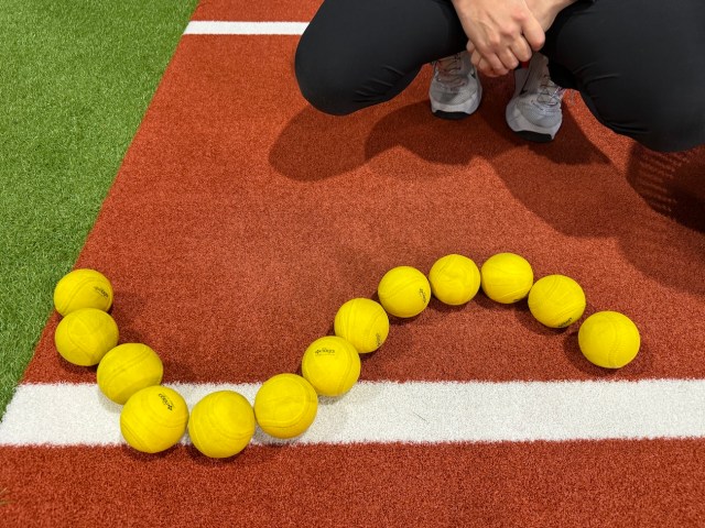 その後、スポンジボールを使ってフォロースルーを体に馴染ませてから……