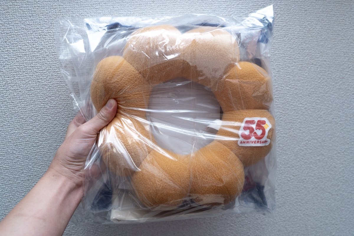 今回最大の目玉はこちら。ポン・デ・リングのぬいぐるみだ。いい感じなサイズ。