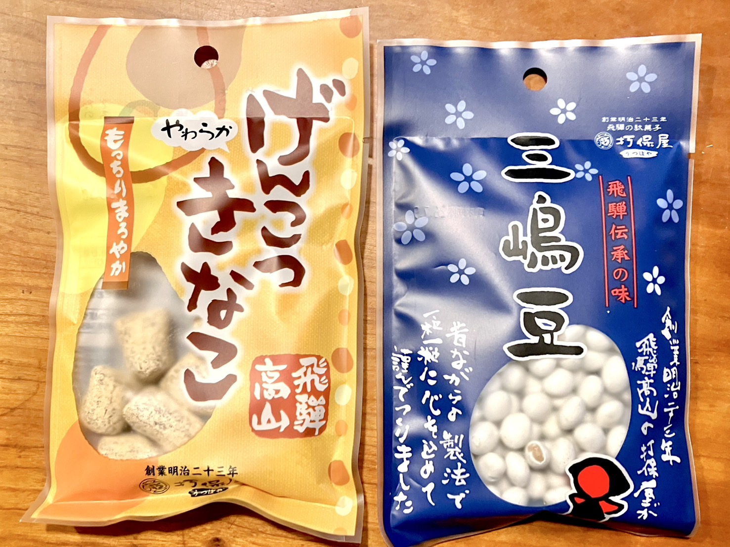 最後にお菓子が3種類。飛騨地域にある「打保屋(うつぼや)」というメーカーの「三嶋豆(みしままめ)」と「げんこつきなこ」という袋入りのお菓子と……