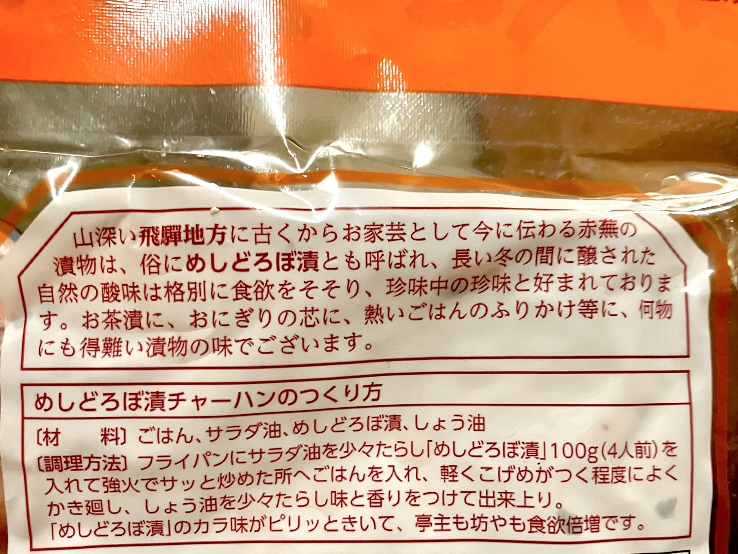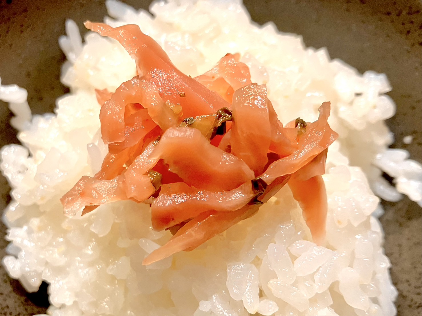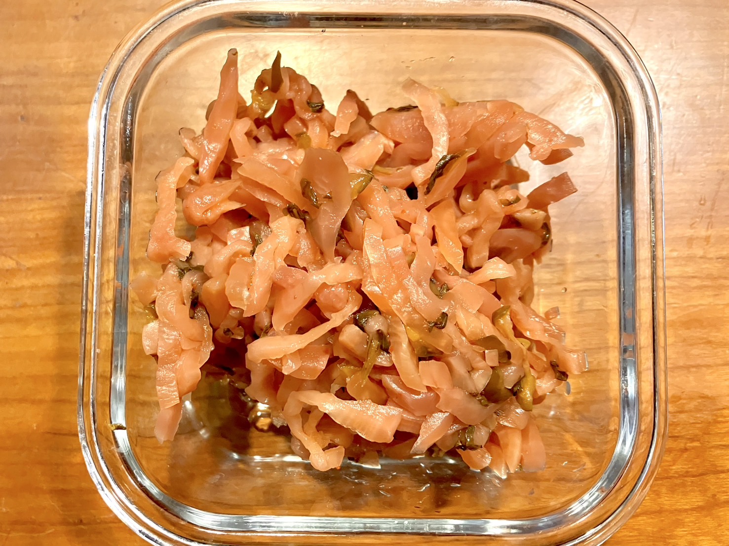 酸っぱさとほんの少しの辛さ、コリコリした食感がお米にめちゃくちゃ合う。なんとなく「しば漬け」を連想させる味だった。
