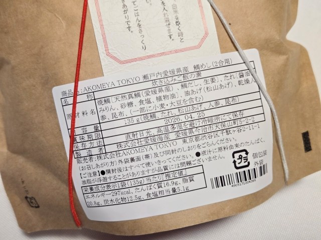 アコメヤの看板商品だけあって、メインの鯛は瀬戸内海産の天然真鯛を使うというこだわりっぷり。鯛のアラからとった出汁や、昆布、松山あげなどが一緒になっていて、お米と水と炊き上げると、本格的な鯛めしが楽しめるのだ。