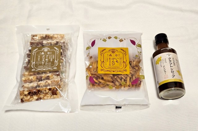 そして、希釈タイプの「アコメヤのクラフトシロップ ジンジャー」と、お菓子が2種類入っていたぞ。食品福袋というだけあって、主食からデザートまで網羅されていたな……! なかなか自分では買わないような商品も入っているので、新しい発見も多くて楽しい!