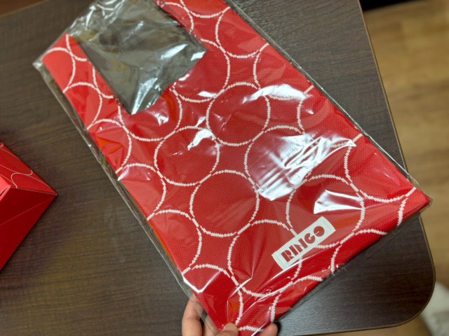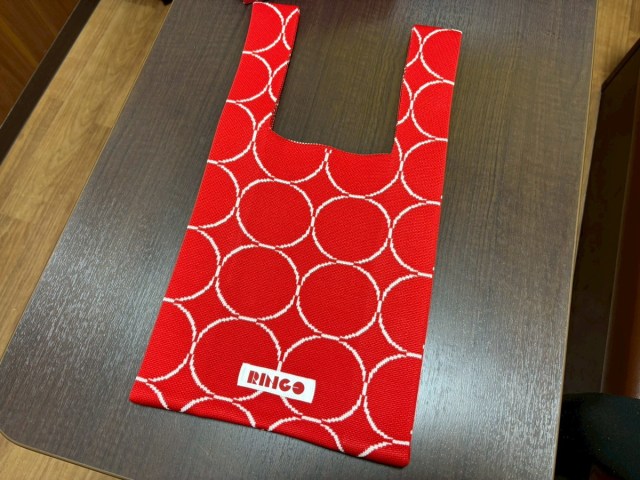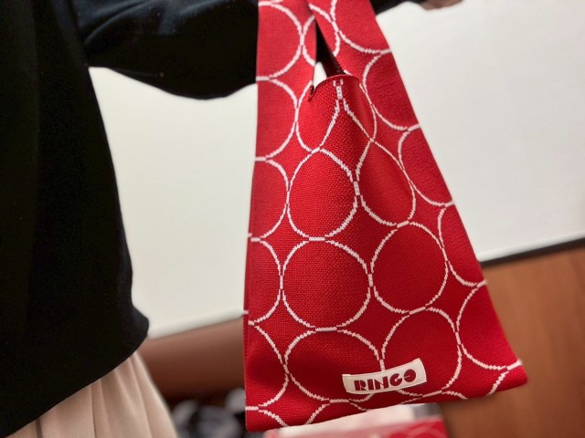 りんごの箱詰めをイメージしたデザインで、目を引く赤いカラーが印象的。縁起の良い赤で福を招いてくれそうだ。
