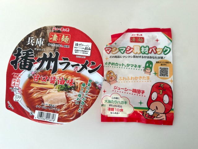 それでは実際に食べてみよう。今回は西日本編から「兵庫播州ラーメン 甘口醤油味」をチョイスし、「マシマシ具材パック」を全部乗せしてみることにした。