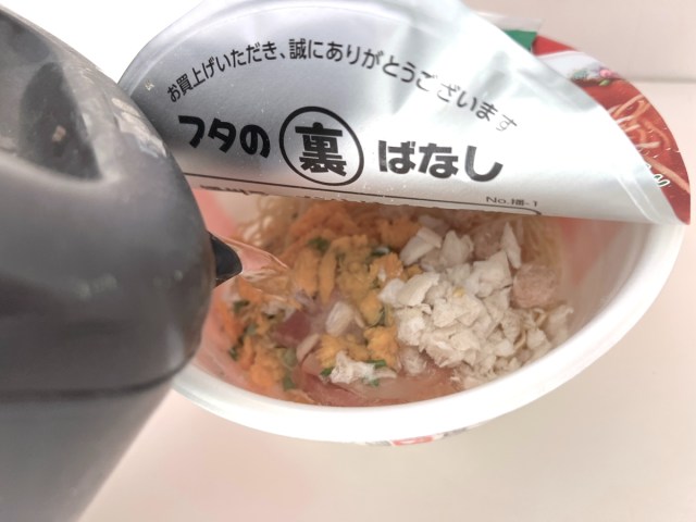 かやくとマシマシ具材パックの中身を入れ、熱湯を注いで4分待つ。