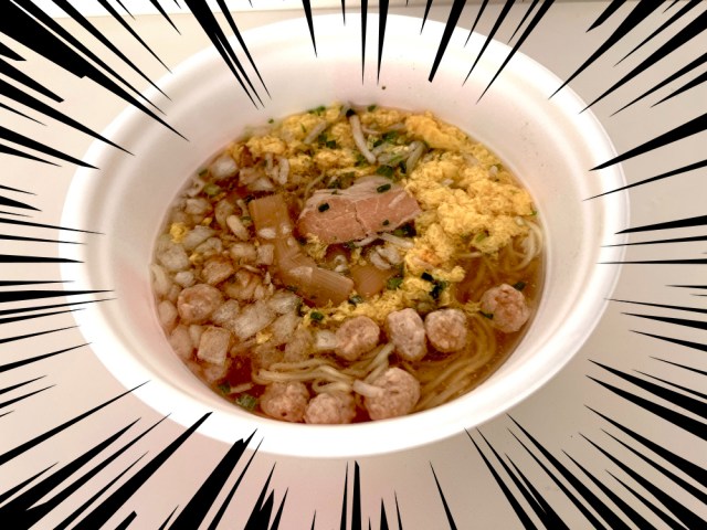 うおおお、これはすごい。カップラーメンとは思えないほど具沢山になった。チャーシュー、メンマに加えて、タマネギ、かきたま、鶏団子が所狭しと並んでいる。見た目のインパクトが半端ない。