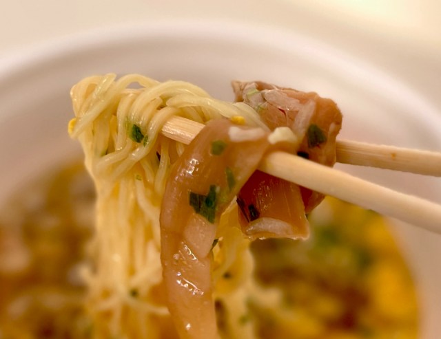 続いて麺をすする。凄麺の特徴であるノンフライ麺は、生麺のような「ツルツル&もちもち」の食感……これがたまらない!