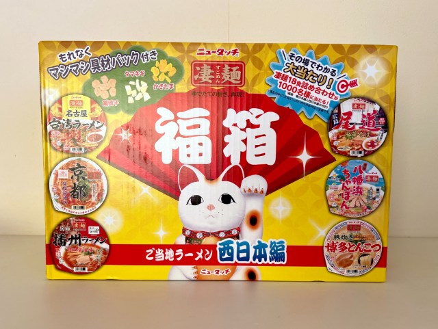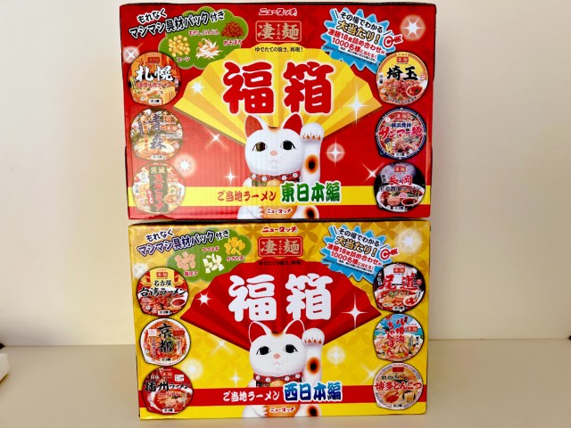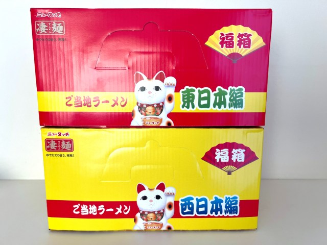 そんな「ニュータッチ」から、12月1日より福袋的なものが販売された。その名も『福箱』。しかも「ご当地ラーメン東日本編」と「ご当地ラーメン西日本編」という、全国各地のご当地ラーメンが集結したセットときた。