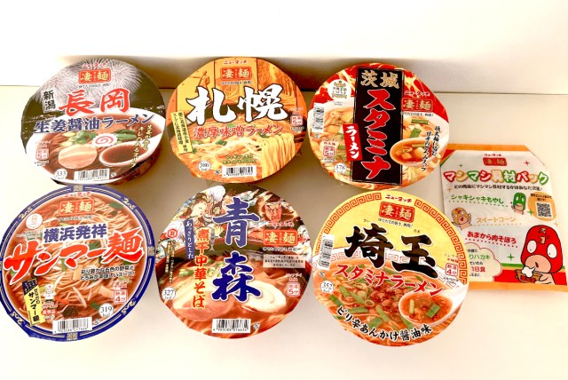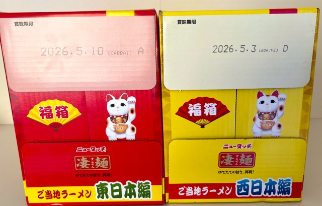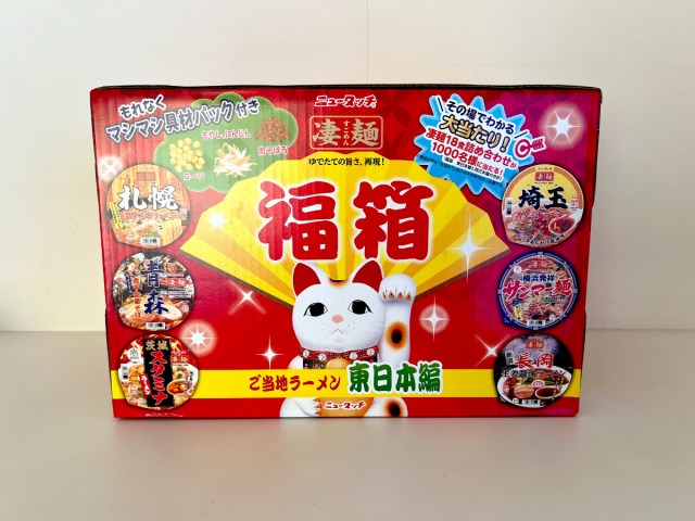 私が購入したのは、「ニュータッチ 凄麺 福箱 ご当地ラーメン東日本編」と「ニュータッチ 凄麺 福箱 ご当地ラーメン西日本編」の2つ。それぞれ税込1801円で、各6種類のご当地ラーメンが詰め合わせになっている。