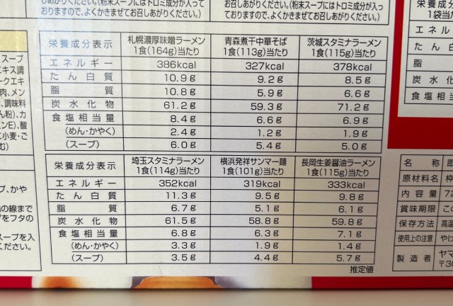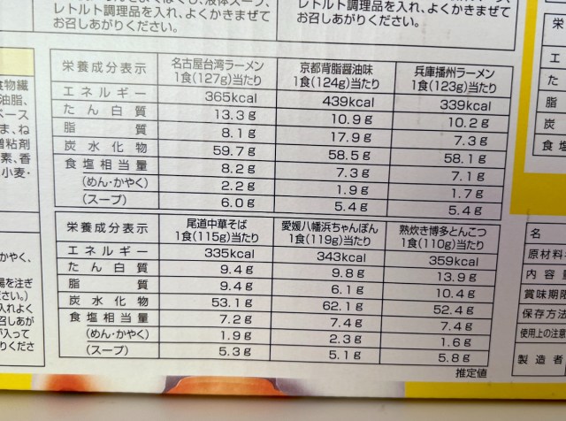驚くべきことに、「京都背脂醤油味」(439kcal)以外は全て300kcal台に収まっている。しかも脂質は多くの商品で10g前後。一般的なカップラーメンが400~500kcalで脂質20g前後であることを考えると、これは驚異的な数値だ。