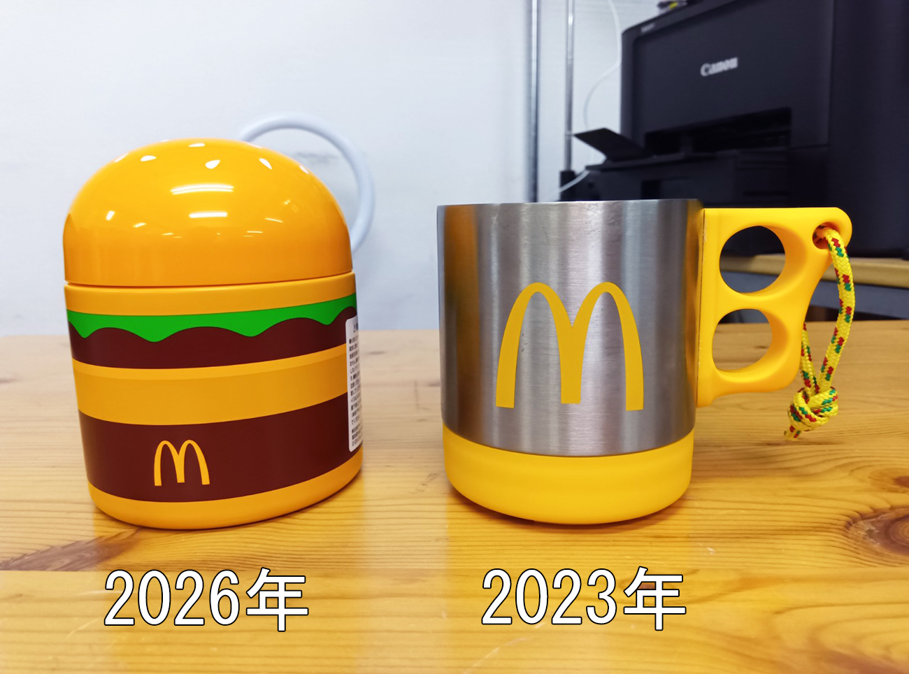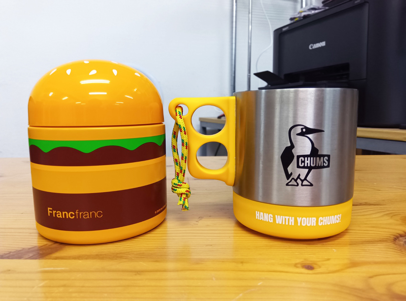 思い出したのは伝説の2023年CHUMSコラボ。なにせ、マグカップもミニショルダーバッグもいまだに普通に使ってる。そこで2023年のマグカップと2026年のスープジャーを並べてみたところ……