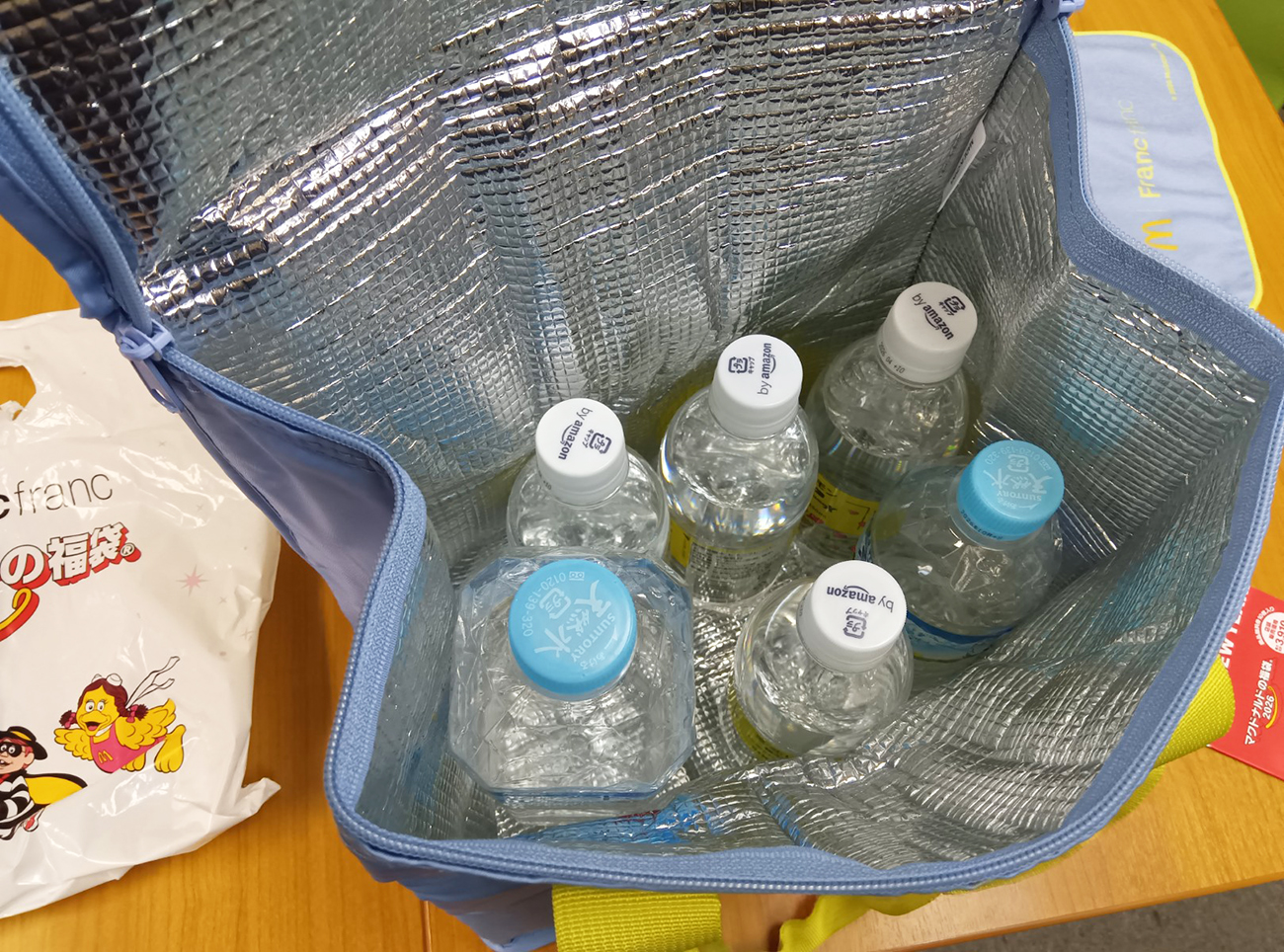 保冷バッグに編集部にあったペットボトルを詰めてみたところ、6本は余裕で500mlペットボトルなら8本入りそうなサイズ感。コンパクトに畳めてリュックにも入るため使い勝手が良いサイズのように思う。