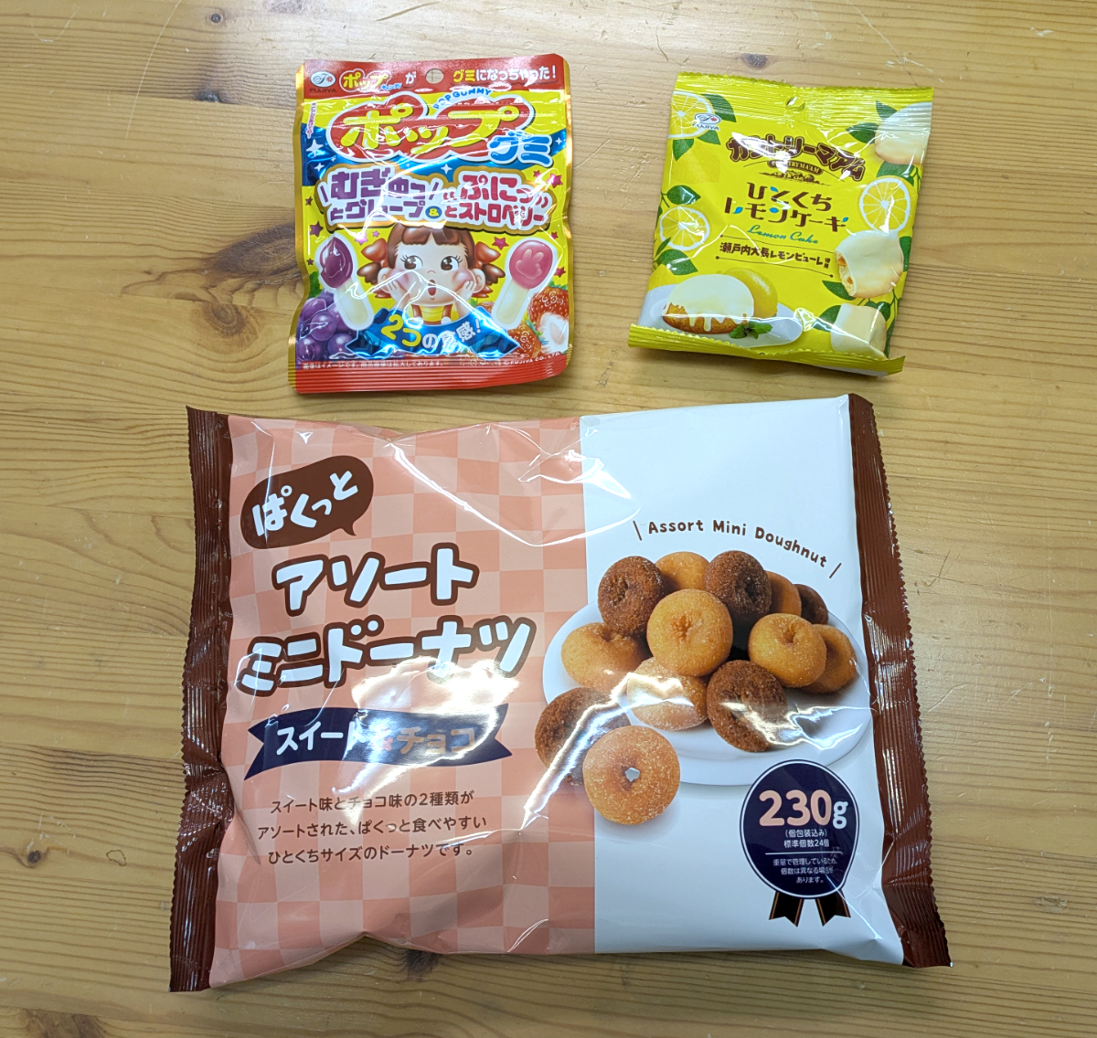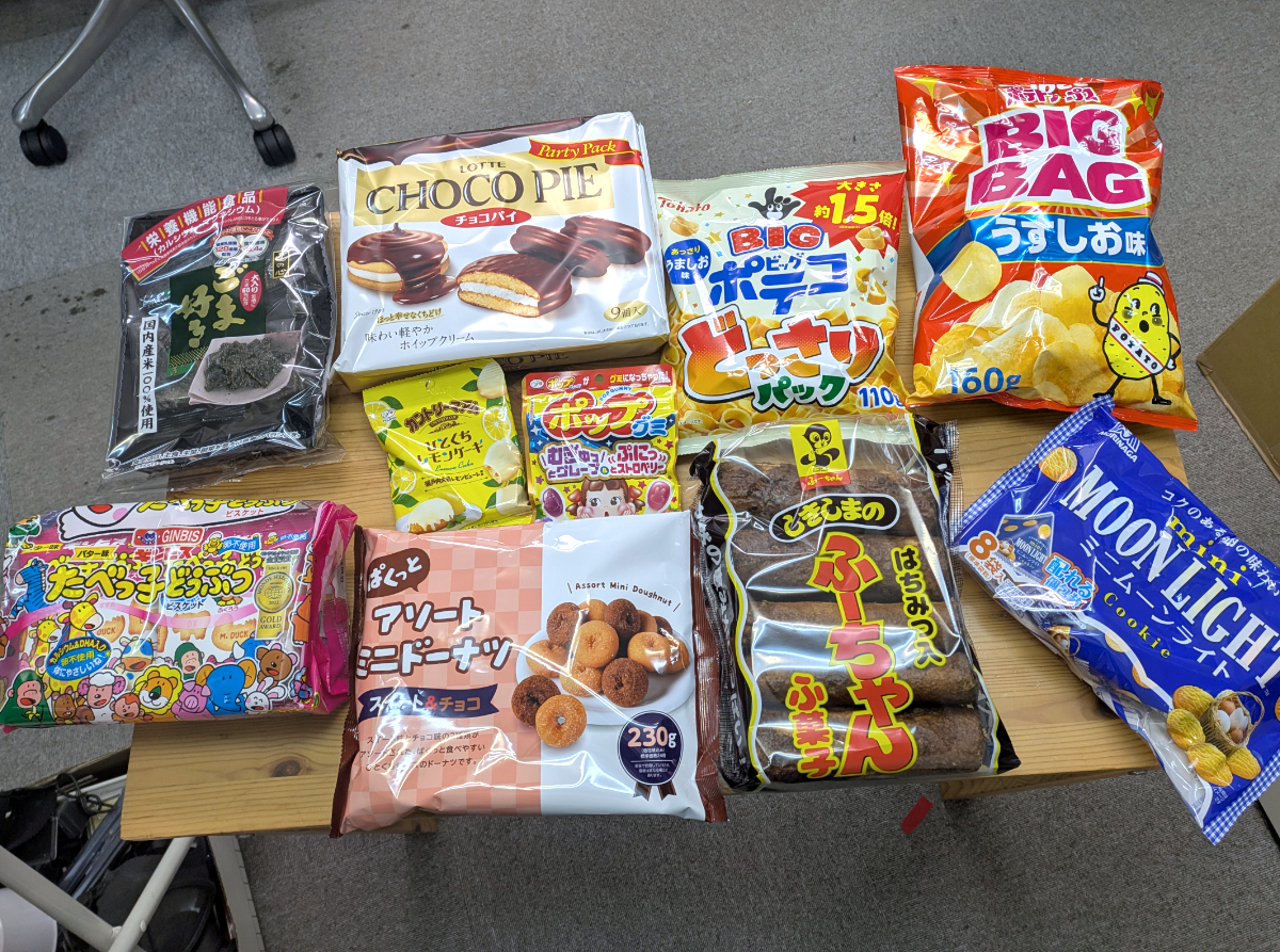 新たに加わったのが、株式会社リボンの「ぱくっとアソートミニドーナツ」、不二家「カントリーマアム ひとくちレモンケーキ」、それから同じく不二家の「ポップグミ」。以上の10点である。