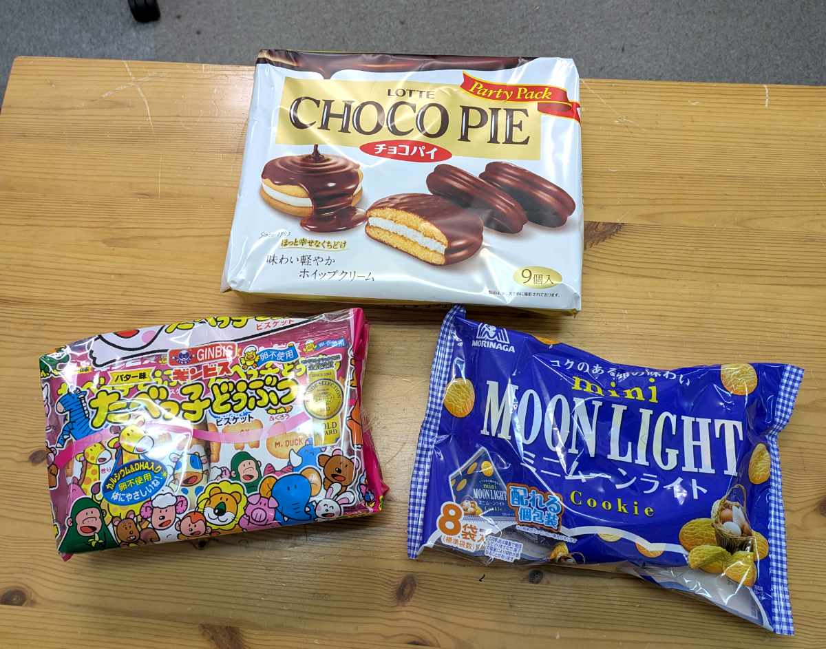 そしてこれまたお馴染み、ロッテの「チョコパイ」に、ギンビス「たべっ子 どうぶつビスケット 6パック」。以前は箱入りだった森永「ムーンライト」は小袋のミニになっていた。