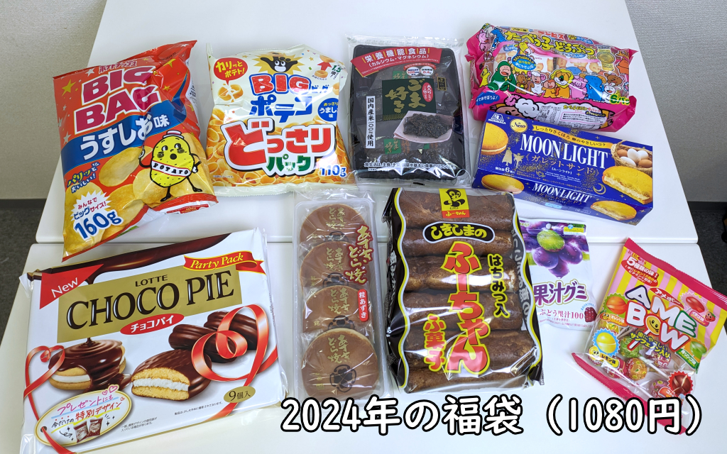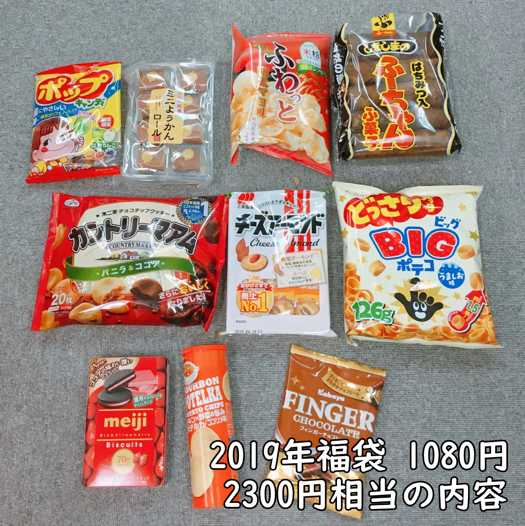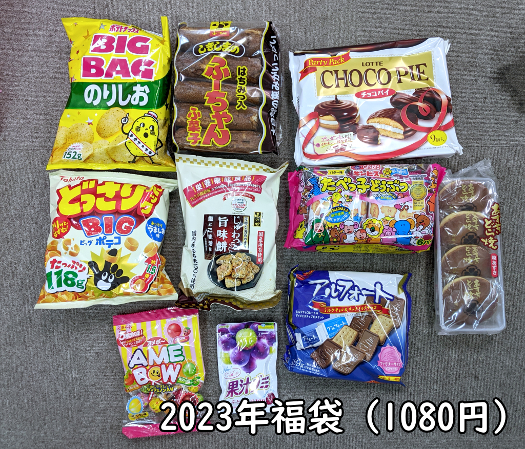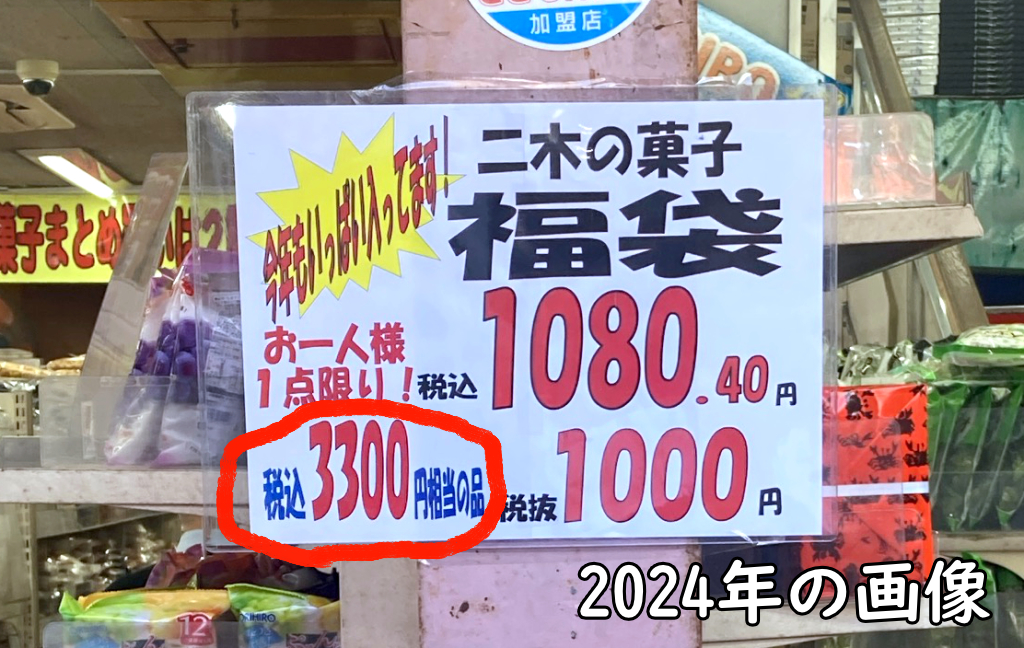 私が二木の菓子の福袋を買い始めたのは、2019年頃だったと記憶している。その年も販売価格は1080円でお菓子10点。当時店頭には「2300円相当」と書かれていた。