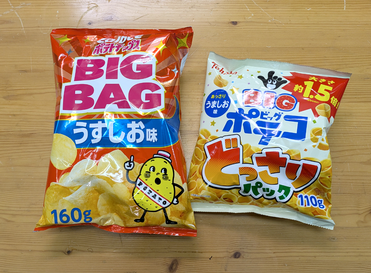 まずは二木の福袋のド定番、カルビー「ポテトチップス BIGBAG うすしお味 160g」と、東ハト「どっさりパック ポテコ・うましお味 110g」。