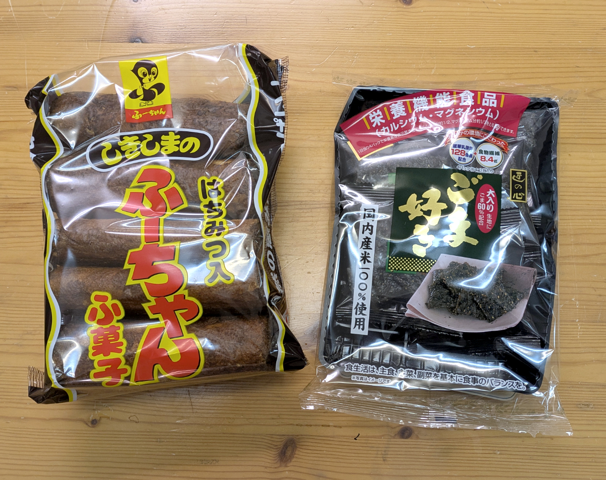 続いてこちらもレギュラー商品の丸彦製菓の米菓「ごま好き」と、しきしま「はちみつ入り ふ菓子 ふーちゃん」。