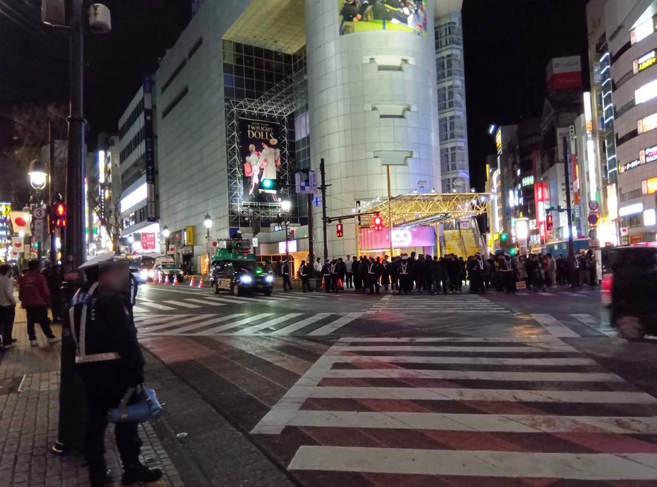 大量のバリケードと警官。そのままハチ公広場内に歩を進めると、メガホンで怒鳴るみたいな声がひっきりなしに響き渡っていることにも気づいた。なにやら事件オーラが凄い。