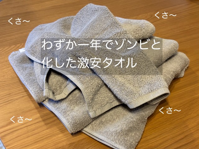我が家では1年くらい前に、5枚セット2000円で買った安いフェイスタオルがまさにそれ。一見、高級タオルと遜色ないように見えるけど、匂うし、洗濯するとくしゃっとなる。たった1年で!? 使ったらすぐ洗濯してたのに……?