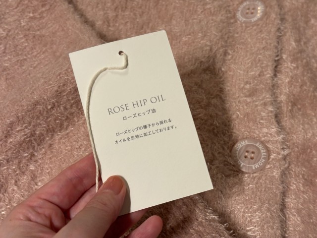 カーディガンはローズヒップオイルが練り込まれた生地らしく、しっとりした質感。