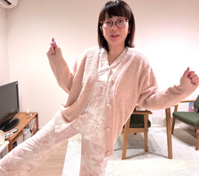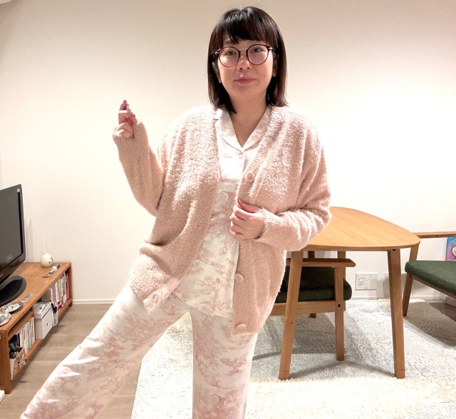 いや、白地にピンクのパジャマと、ピンクのふわふわカーディガン、かわいいんだけど……かわいいんだけど……。