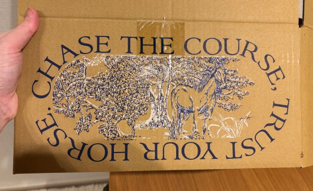▼箱も馬デザイン!「Chase the course,Trust your horse(コースを追いかけ、馬を信じろ)」は今年の競馬の格言にしようかな