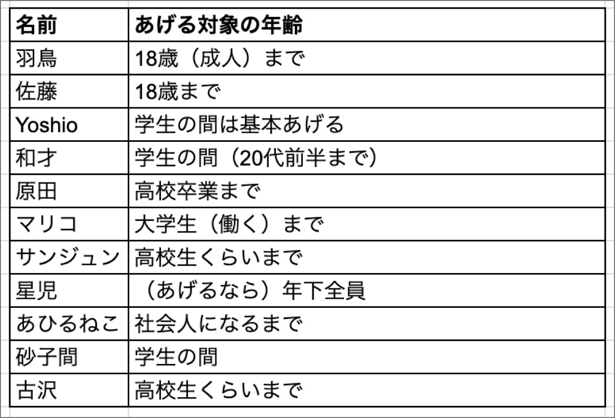 「何歳の子まであげる?」という問いには、ほぼ全員が「高校卒業」または「学生の間」と回答している。