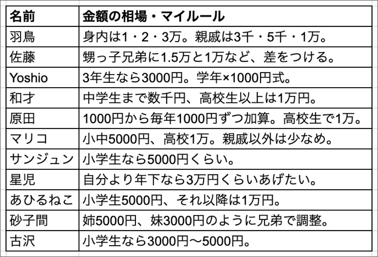 一番の悩みどころである金額。11人の回答を分析すると、大きく3つの「流派」に分かれた。