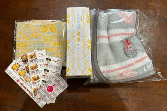 さらにはブランケットも入っていて、こちらは手触りが良くふわふわ。先の2つと柄が違い、ちょっとだけビッグエコーらしさがのぞいているような気がする。これからの季節、膝にかける用として重宝しそうだ。