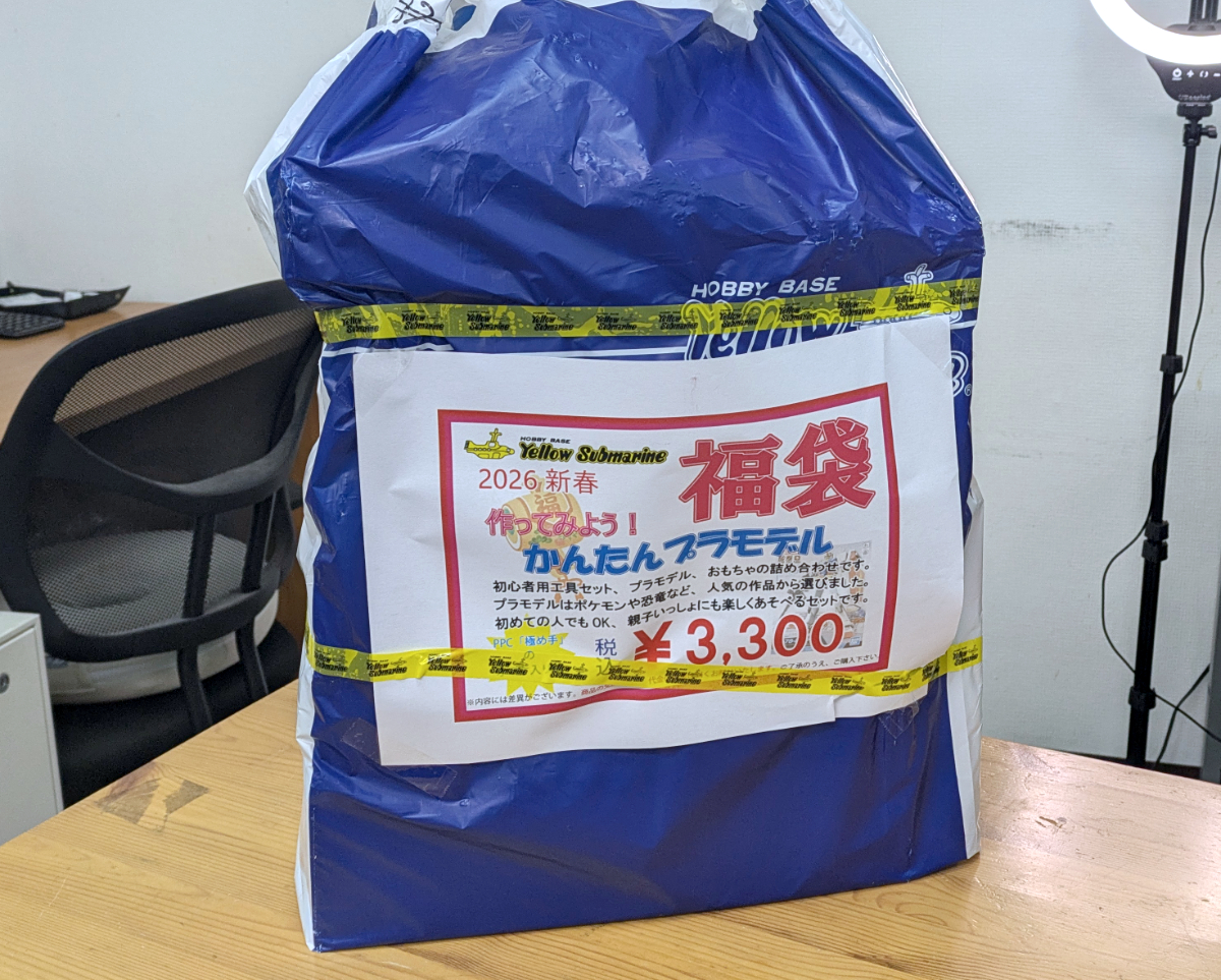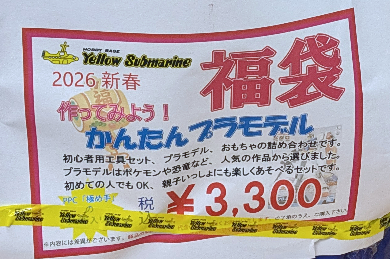 そんなわけで、今年もアキバから始まり、さっそくラジオ会館の「イエローサブマリン秋葉原本店ミント」でかんたんプラモデルの福袋を購入。プラモ9点を含む15点も入ったこの福袋のお値段はなんと! ……3300円!! 安い!