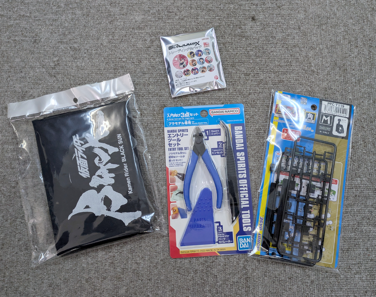 さっそく中身を出してみよう。まずはプラモの工具3点が入った「入門向け3点セット」。昨年話題だったガンダムジークアクスの「トレーディング缶バッジ」。仮面ライダーBLACK SUNの「トートバッグ」。それからホビーパーツの「HOBBY BASE- 極め手ver.2.0 角」である。
